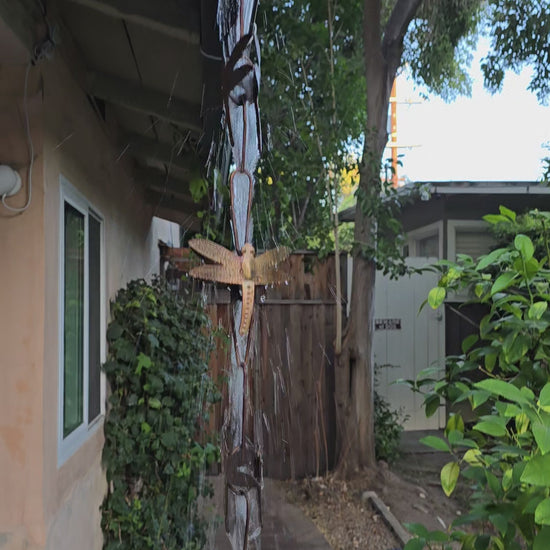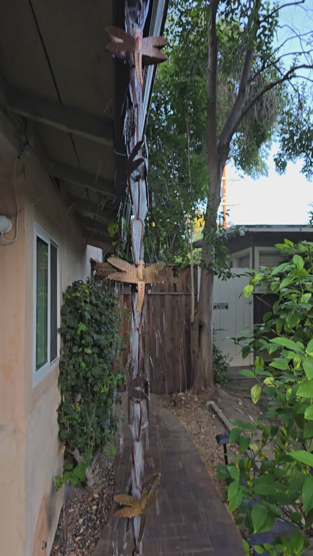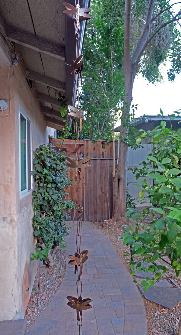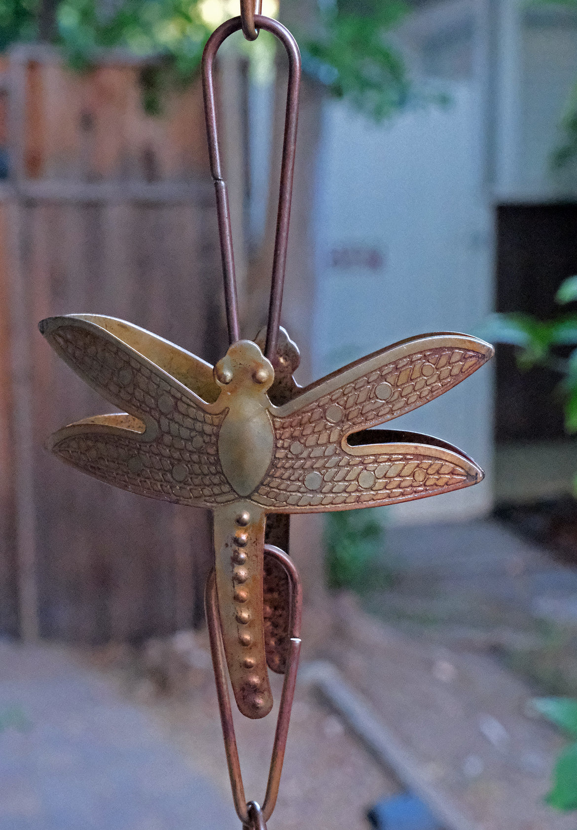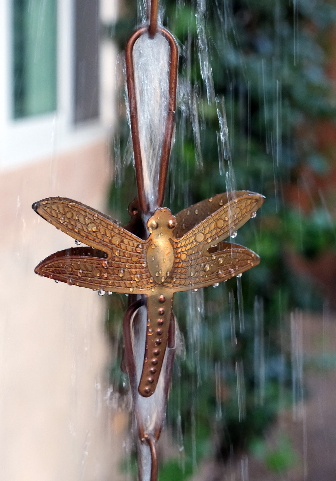 Replace your gutter downspout and add this decorative metal rain chain to the gutter on your home. Beautiful water feature for when it rains. The dragonflies face out both ways, so it looks good from any angle.