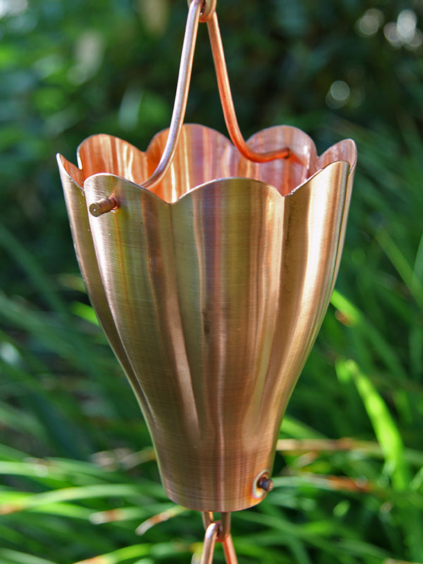 One of the largest cup style rain chains - each cup is well over 4 inches across by 5 1/2 inches in length! This rainchain will handle heavy waterflow conditions. The pure, thick unfinished copper will age to a beautiful patina over time. An artistic downspout for your home!