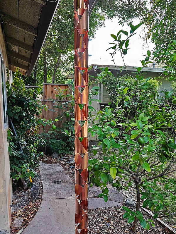 A new origami-inspired rain chain design. Modern! Highly efficient, beautiful and interesting shapes intersect to make a mesmerizing design. Very open looking but transports water really well! Hand crafted in high grade steel, then plated in thick, pure copper.
