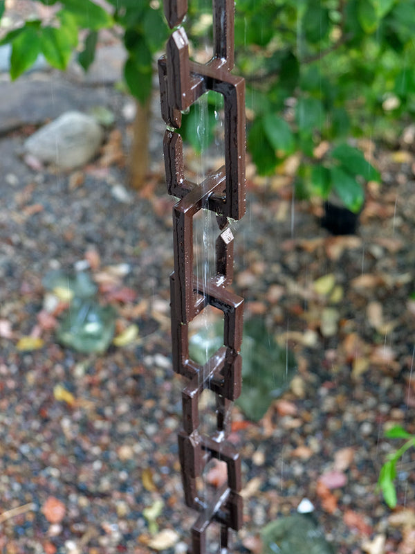 Hand cast in aluminum, finished and then powdercoated the perfect shade of bronze, these architectural links are an artistic, sculptural rain chain design. With a unique interlocking design, any length can be ordered and they are very easy to assemble.