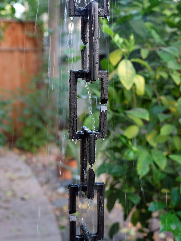 Hand cast in aluminum, finished and then powdercoated matte black, these architectural links are an artistic, sculptural rain chain design. With a unique interlocking design, any length can be ordered and they are very easy to assemble. Small variations in the texture from casting is normal.
