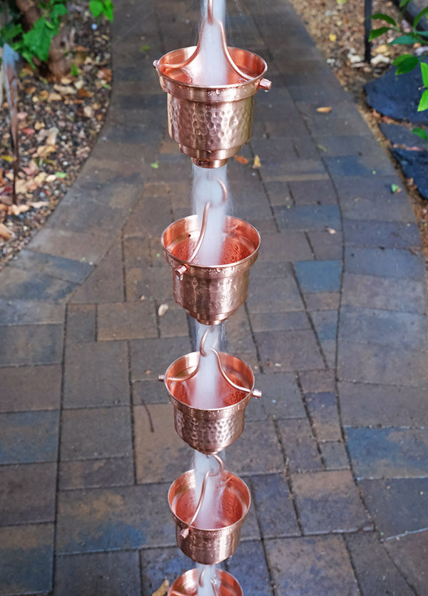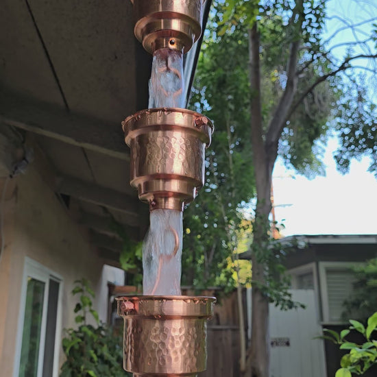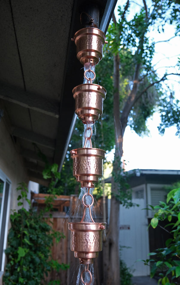 This original design has vertical, smooth surfaces and a stepped expression ("Naoki" means 'straight' or 'upright' in Japanese). Made of thick, pure unfinished copper, the cups feature straight lines and hand hammered sides. They have a folded lip at the top and are very strong. The ring between the connecting wires adds a beautiful finishing touch to the design. The connecting wires are also pure copper.