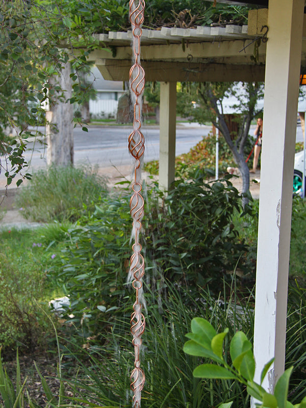 A fancier variation on our Double Loops and Oval Loops link chain. Pure copper with a loop at the top and bottom. In heavier rainfall, water follows the path of the wires, creating an interesting effect! Includes copper V-hook for easy installation.