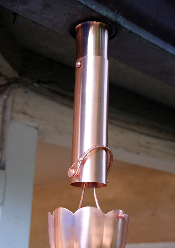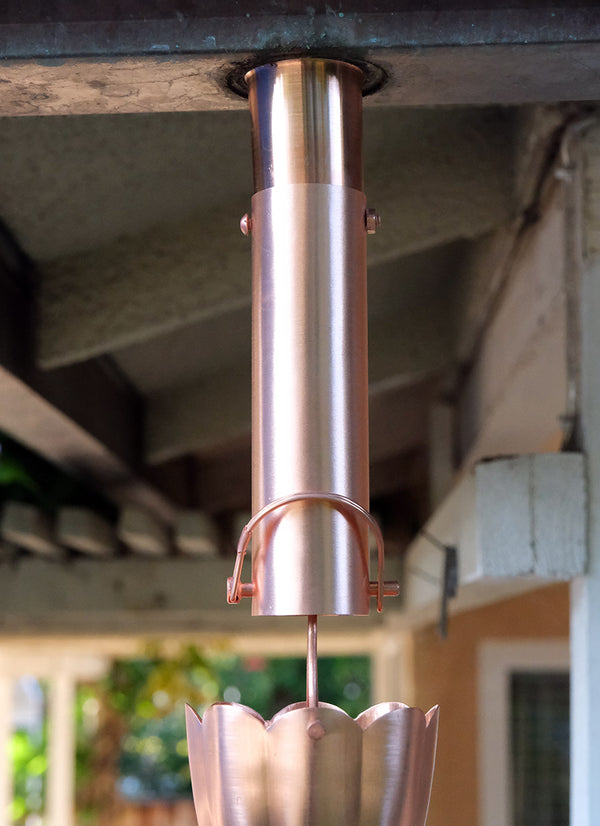 A pure copper 6" extension for our RCR-COP installation kit and RCR-HR-COP half round installation kit. Need to lower your chain 6"? or pass through a soffet? comes with a screw and nut as shown; the D clip to attach the chain is relocated to the bottom holes.
