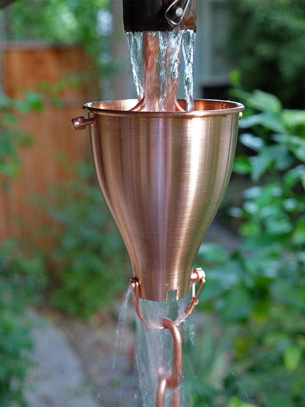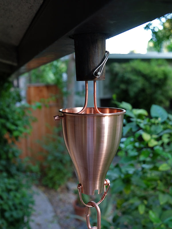 Are the outlet dimensions from the gutter larger than your link rain chain? Our new Link Chain Reducer in pure copper is a specially designed, large rain chain cup with a D-clip across the bottom. Link chains tend to splash more than cup designs, but this helps your link chain work the best that it can. |