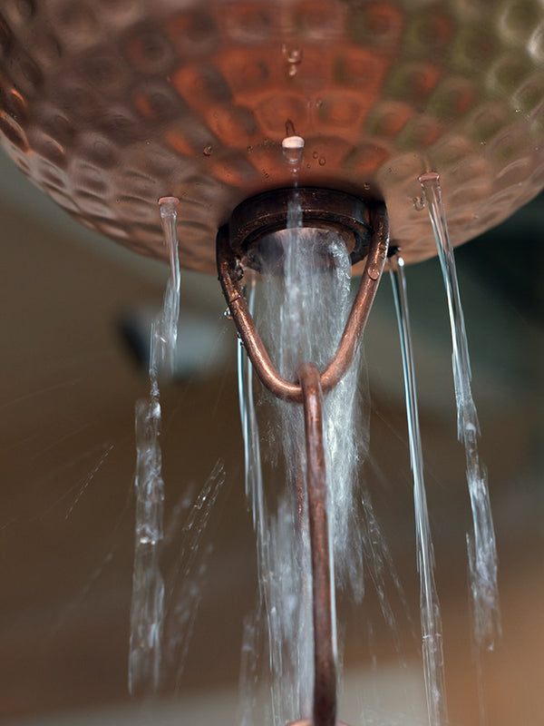 Hight grade steel links and brass hardware fittings, both copper plated, accompany the large bowls. Extra holes are added to the bottom for a beautiful cascading effect when water drains out.
