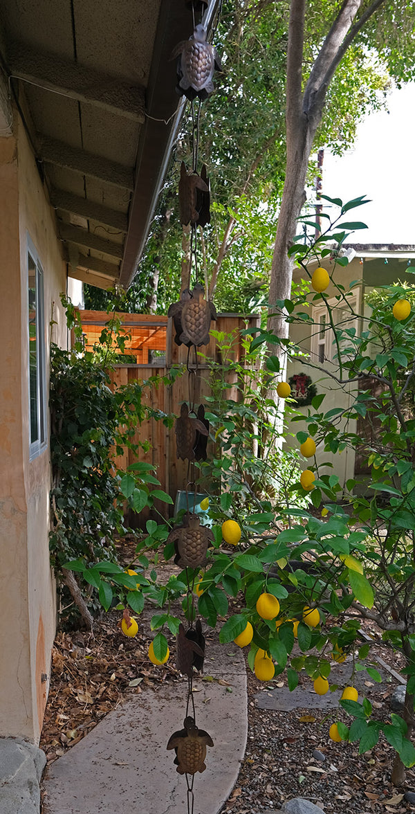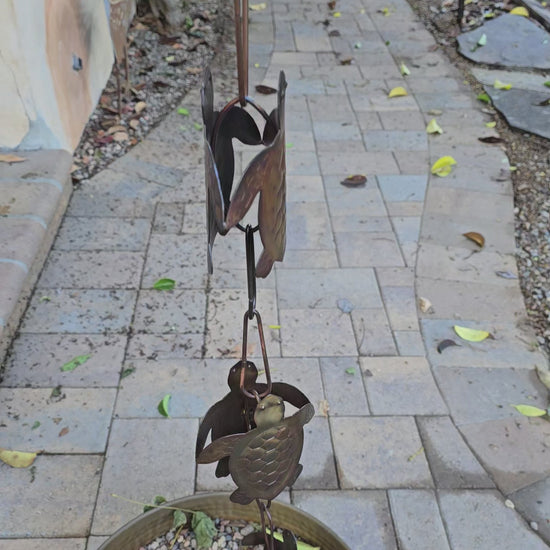 Replace your gutter downspout and add this decorative metal rain chain to the gutter on your home. Beautiful water feature for when it rains. The turtles face out both ways, so it looks good from any angle.